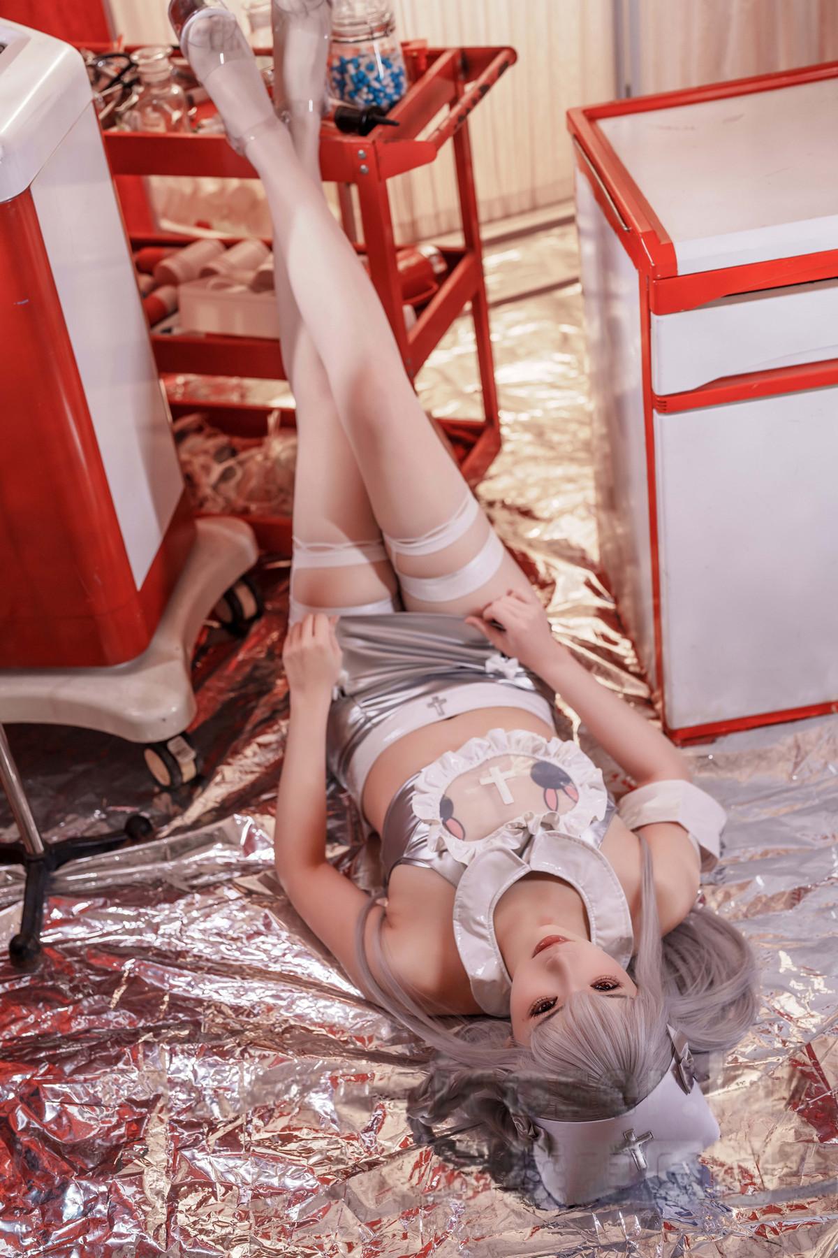 Coser小姐姐雪琪SAMA银发魔女护士实习日记主题性感银色短裙配白丝吊袜秀美腿诱惑写真