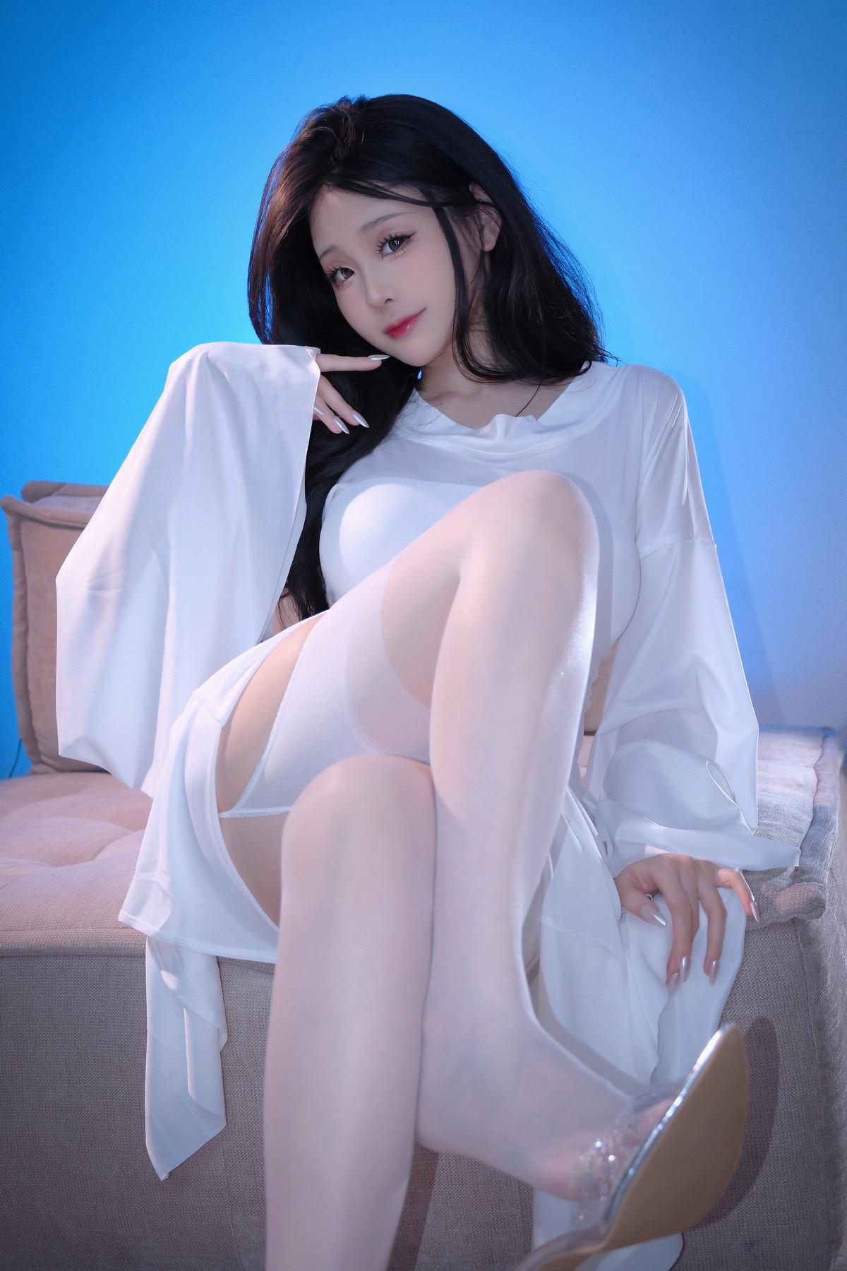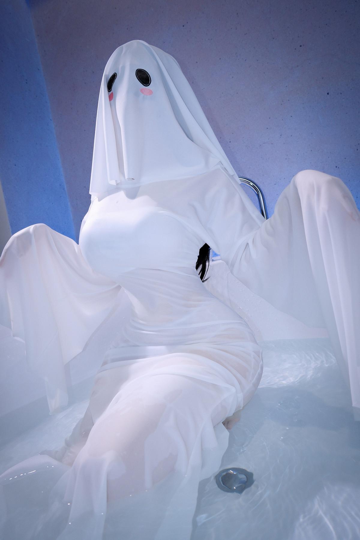 网络美女miko酱ww幽灵主题私房浴室性感白色露背连衣裙配白丝吊袜秀凹凸身材诱惑写真