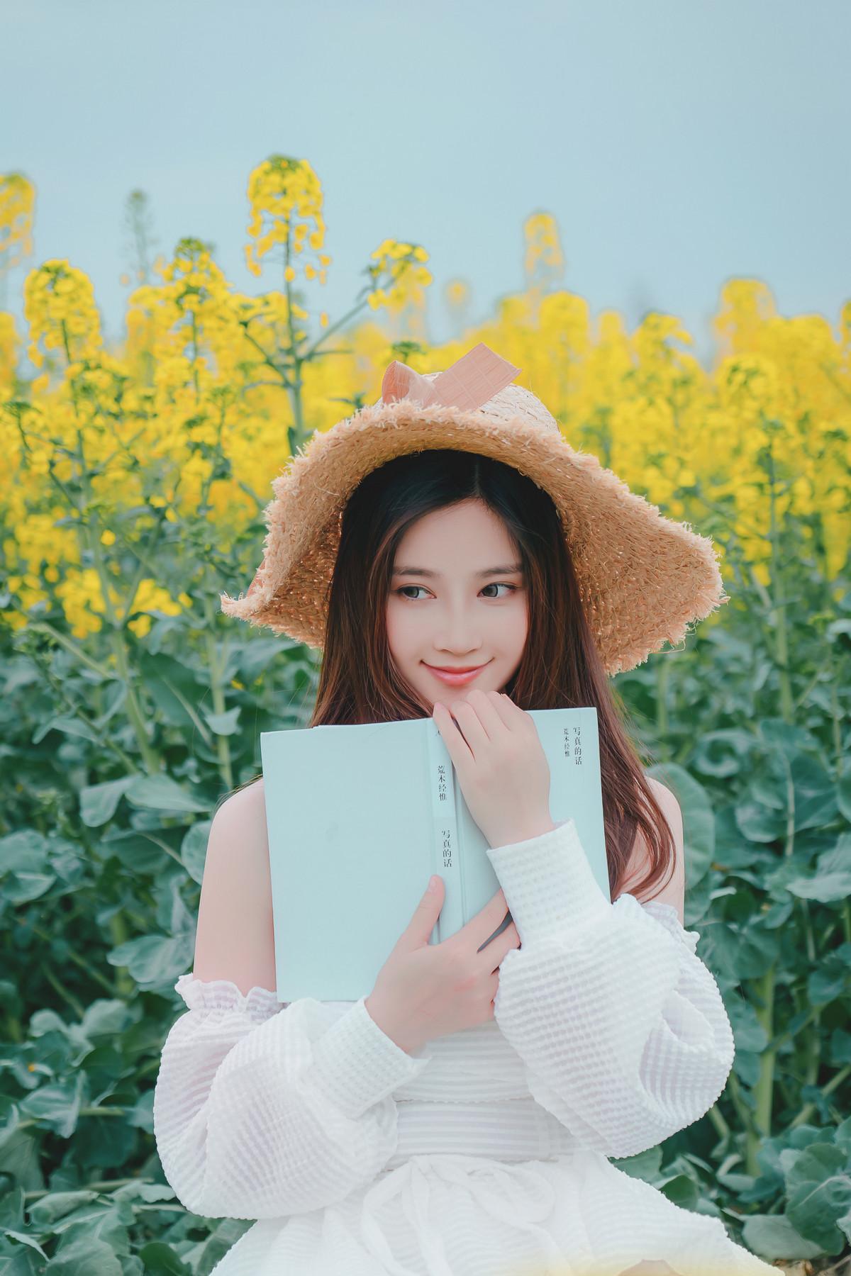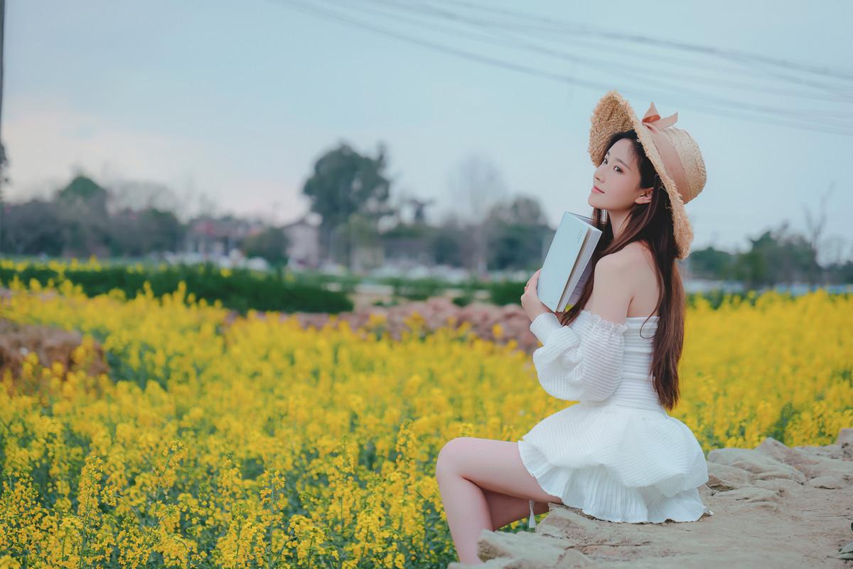 网络美女年年Nnian花野主题户外油菜地性感白色低胸连衣短裙半脱秀惹火身材诱惑写真