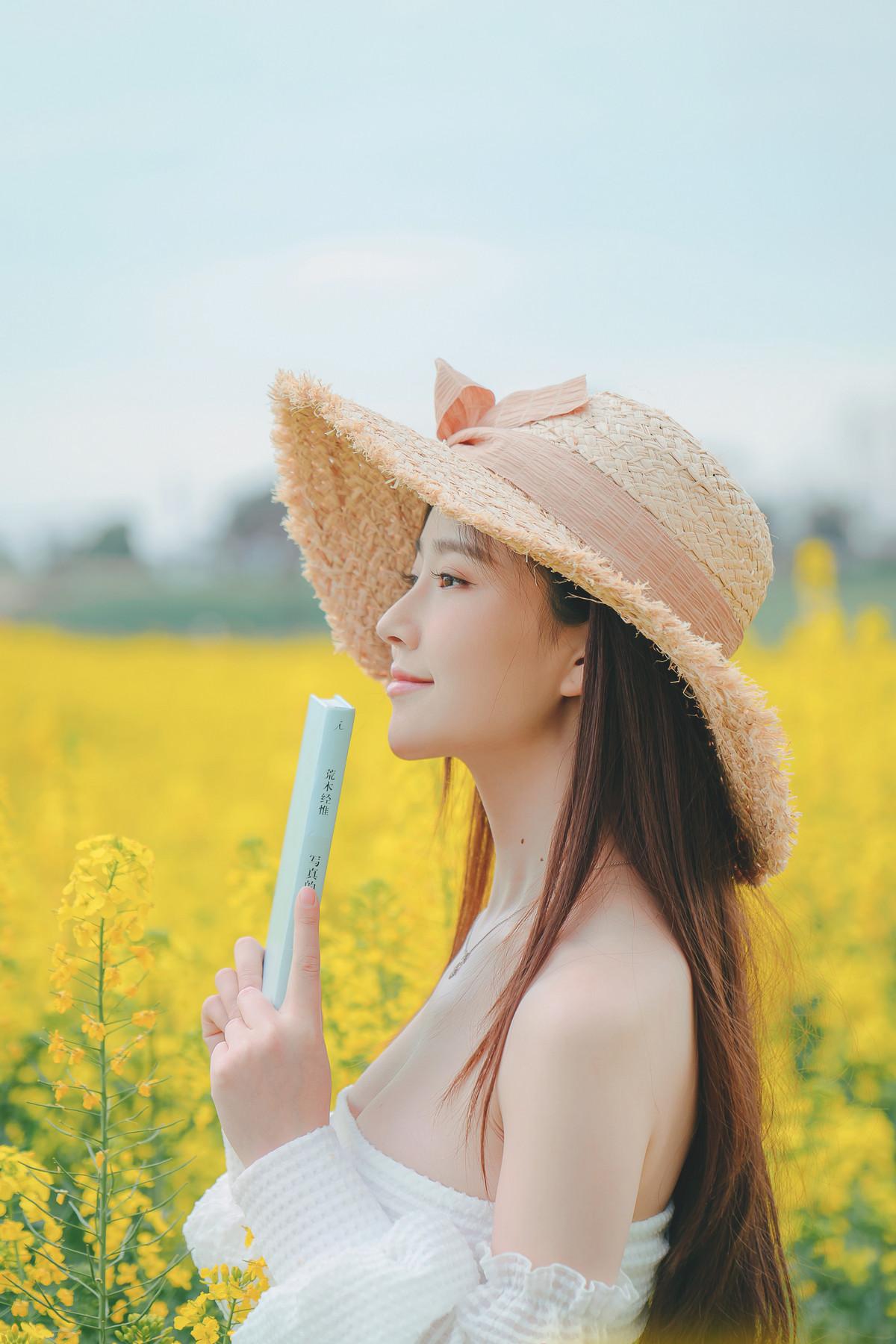 网络美女年年Nnian花野主题户外油菜地性感白色低胸连衣短裙半脱秀惹火身材诱惑写真
