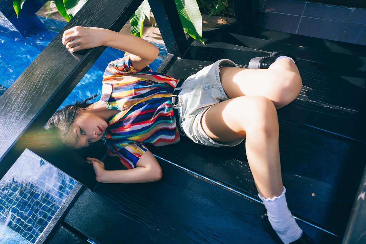 动漫博主蠢沫沫凝视主题性感花色衬衫配牛仔短裤露黑色蕾丝内衣秀曼妙身姿诱惑写真