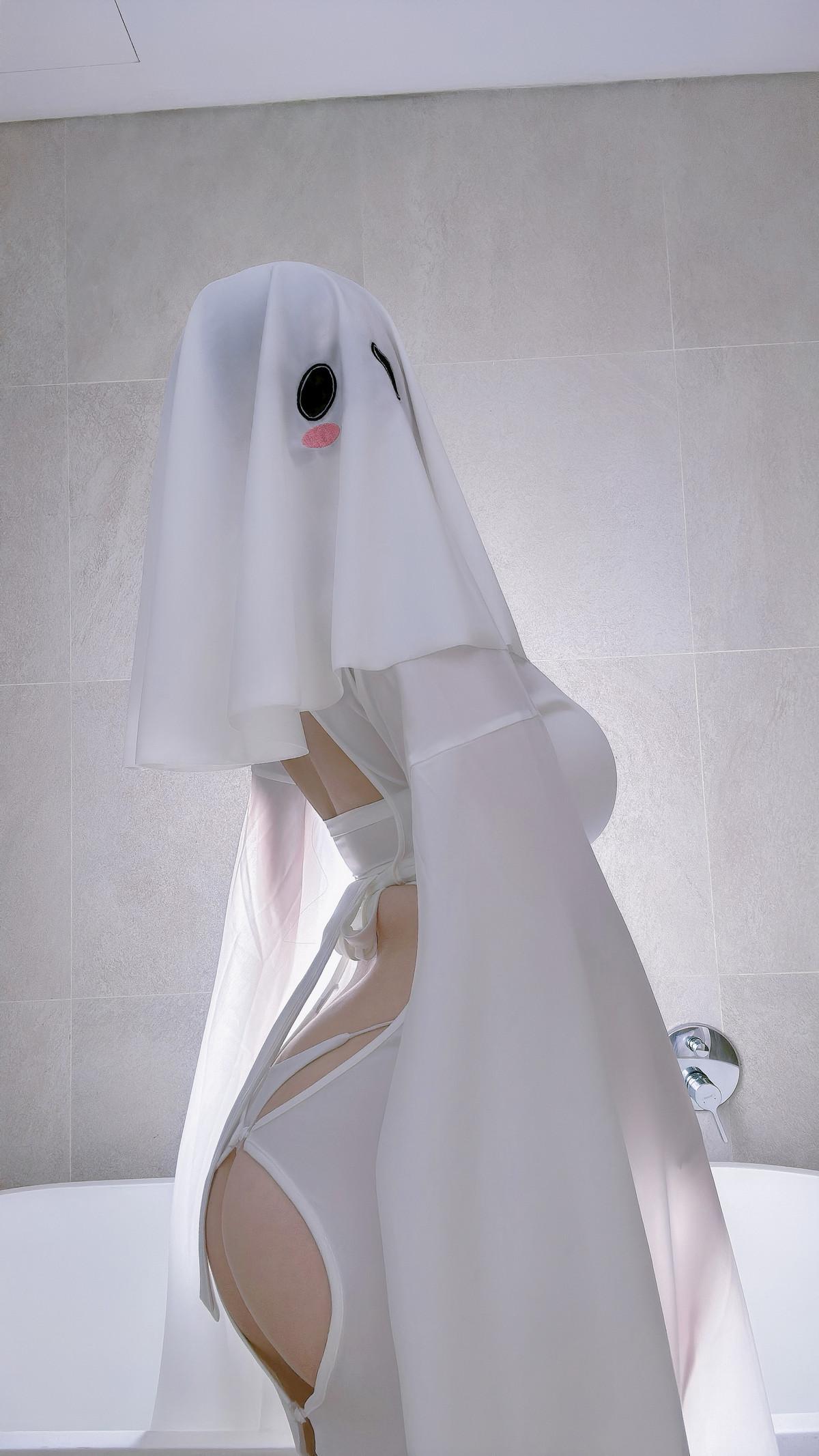 网络美女miko酱ww幽灵主题私房浴室性感白色露背连衣裙配白丝吊袜秀凹凸身材诱惑写真