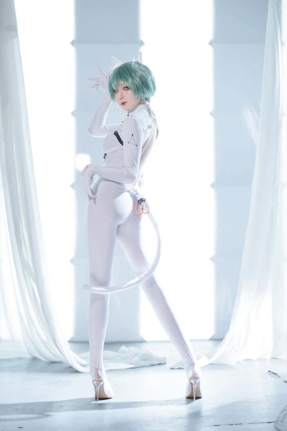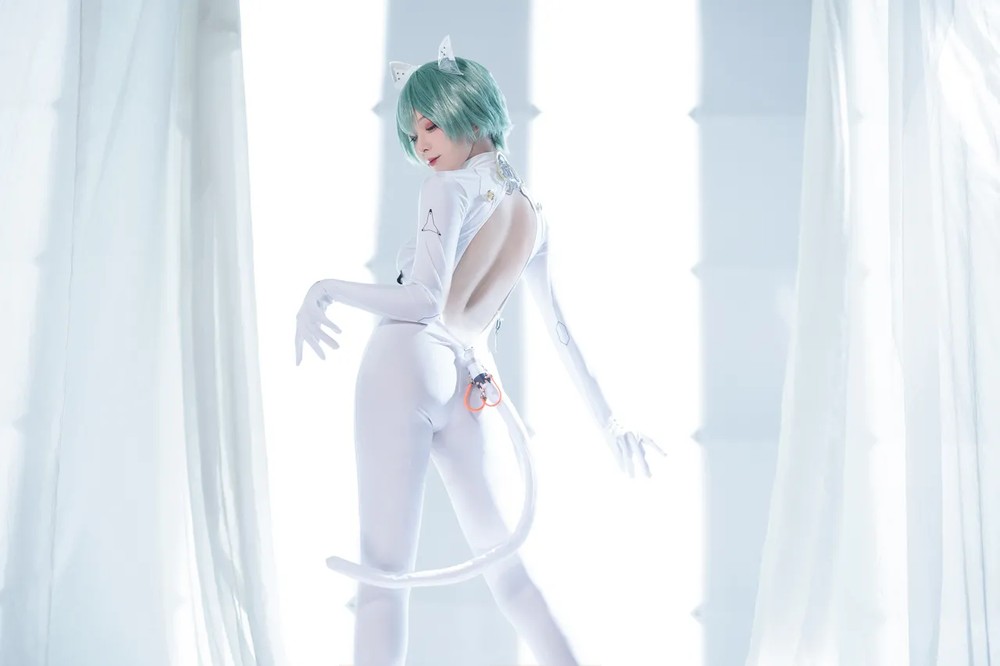 动漫博主水淼aqua原创竞泳主题性感灰色外衣下紧身高叉连体泳衣秀完美身材诱惑写真