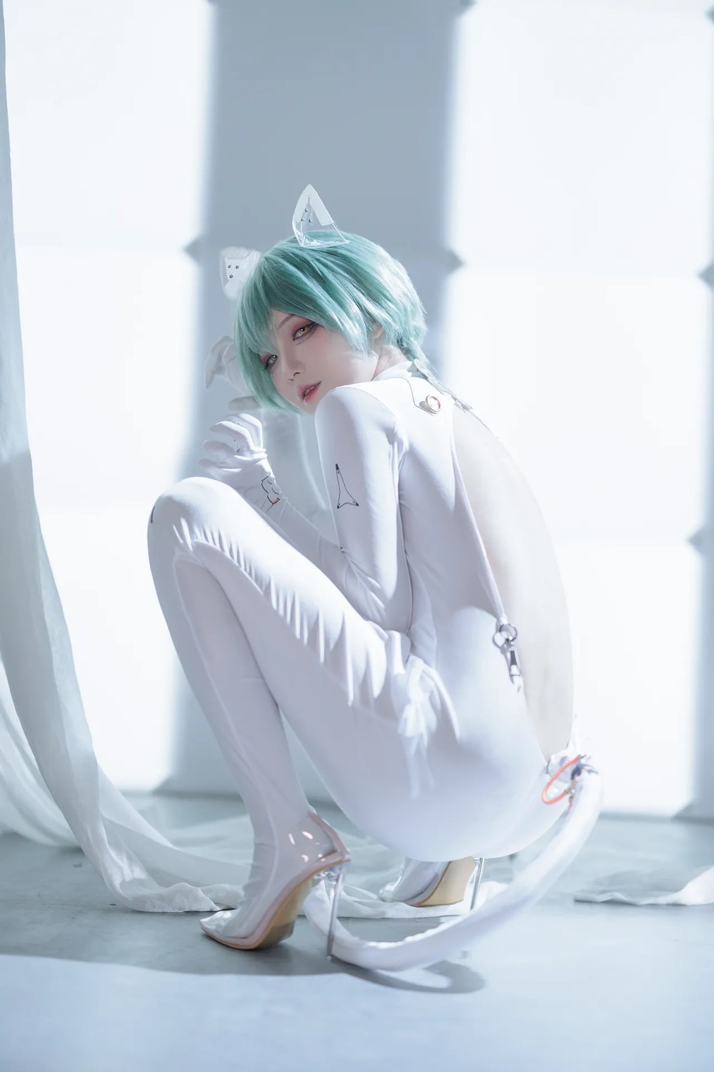 动漫博主水淼aqua原创竞泳主题性感灰色外衣下紧身高叉连体泳衣秀完美身材诱惑写真