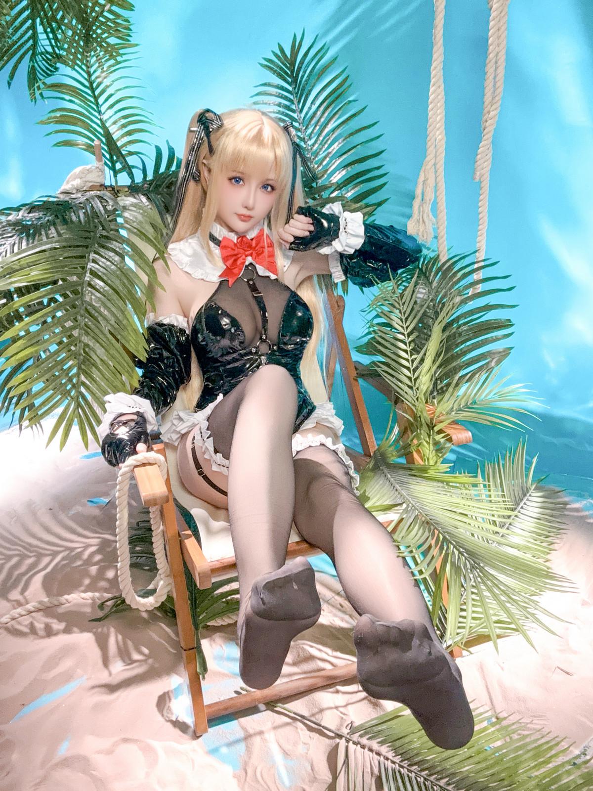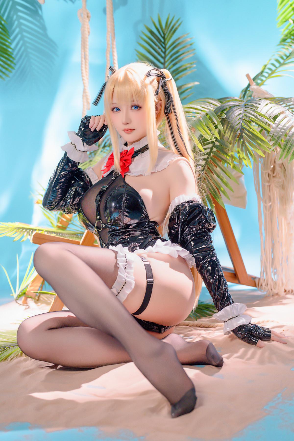 Coser小姐姐星之迟迟玛丽萝丝皮衣泳装主题性感黑色皮质高叉连体衣配黑丝袜秀美腿诱惑...